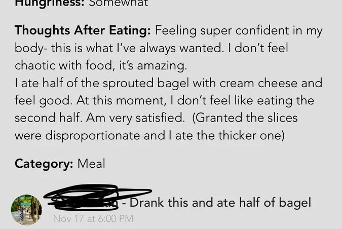 In SEAM we are attuning to the pleasurable experience of eating while creating a neutrality around food. We don't use calories or points or macro tracking as the measure of whether we can eat a food or not. Instead, we learn to build the intrinsic trust in our own ability to self regulate our appetite. We create an internal accountability system based around choice and natural consequences of that choice, rather than a number or external construct we have to follow.
